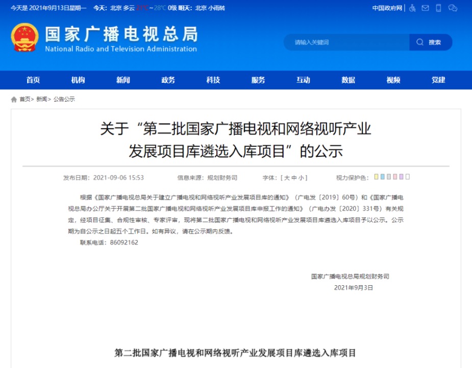 查看詳情?國家廣播電視總局規(guī)劃財務司發(fā)布《關于“第二批國家廣播電視和網(wǎng)絡視聽產(chǎn)業(yè)發(fā)展項目庫遴選入庫項目”的公示》